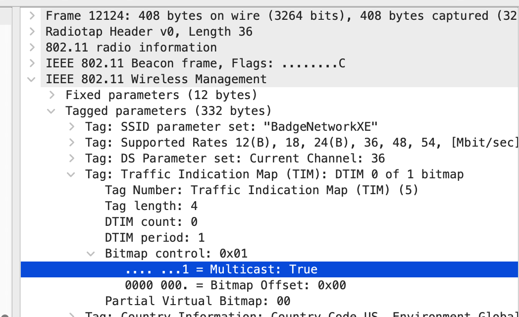 Taking a closer look at the beacon, we see the Bitmap Control Field of the Traffic Indication Map IE is set to Multicast ‘True’. This informs stations expecting multicast to stay awake for traffic to follow.