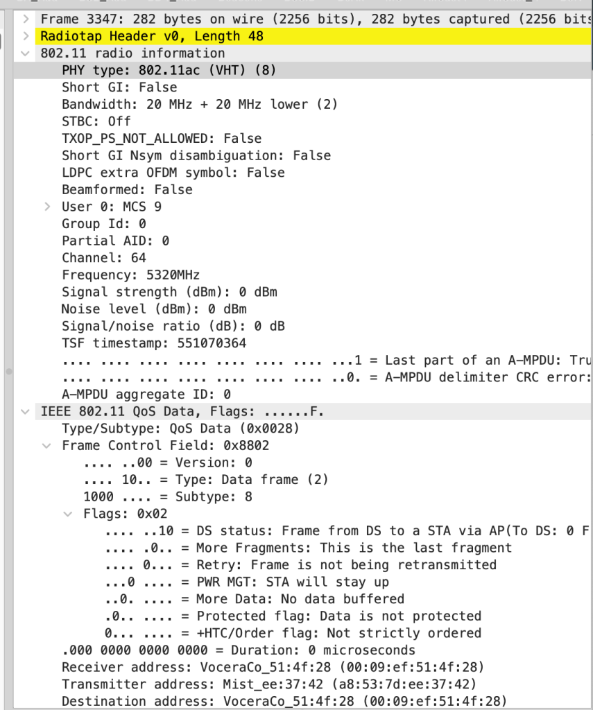Taking a closer look at one of these downstream frames we see MCS 9 being used with the VHT PHY (802.11ac). We also notice the frames are QoS Data Frames.