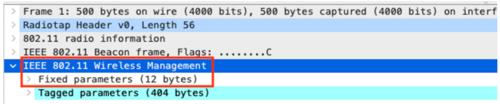 3. Expand the IEEE 802.11 Wireless Management and Tagged parameters headers in the Packet Details Pane