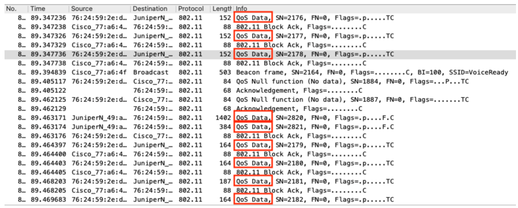 2. Scroll through frames in the Packet List Pane until you see either Data or QoS Data in the Info column